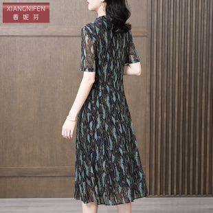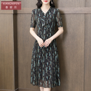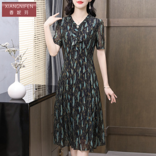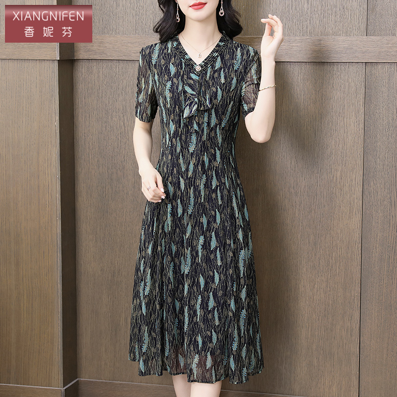 优雅女士高腰显瘦 气质妈妈v领网纱连衣裙时尚 香妮芬2025夏季 新款