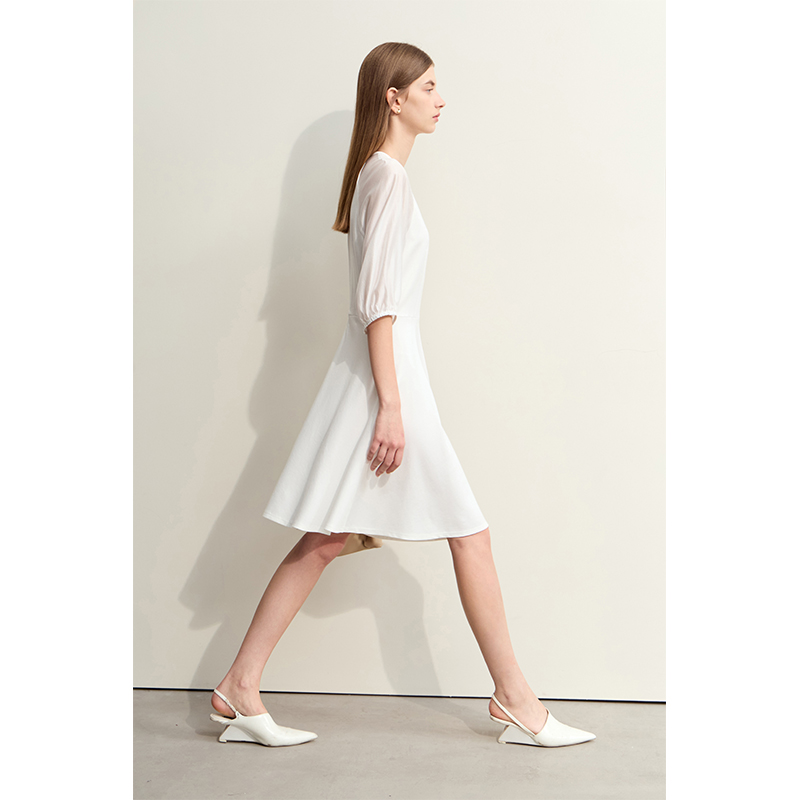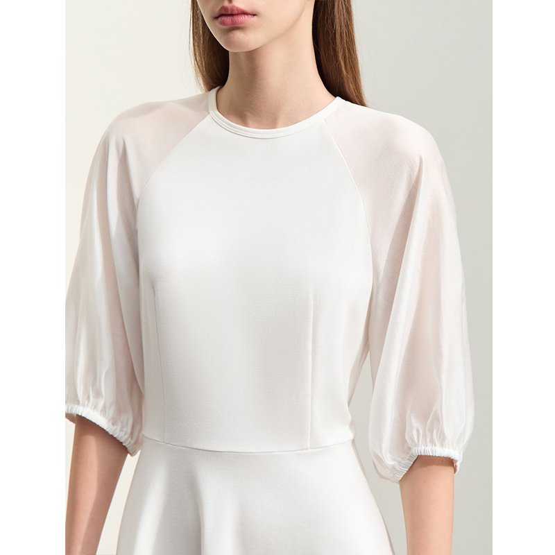 收腰小黑裙子 中袖 Amii2025夏新款 通勤圆领撞料拼接连衣裙女插肩袖