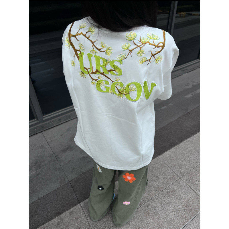 欧美高街国潮t恤潮牌小众情侣半截袖 美式 夏季 男款 罗汉松刺绣短袖