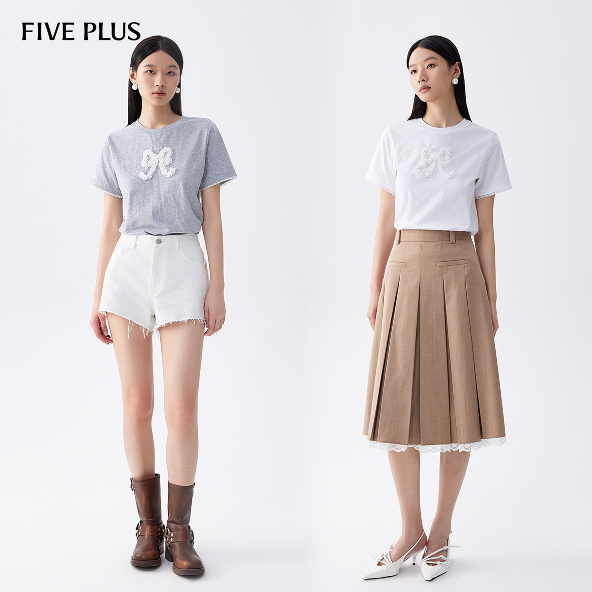 女夏装 上衣蝴蝶结拼接花边圆领少女感新款 PLUST恤女短袖 FIVE