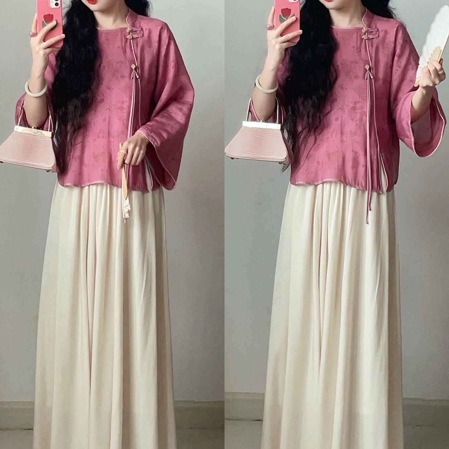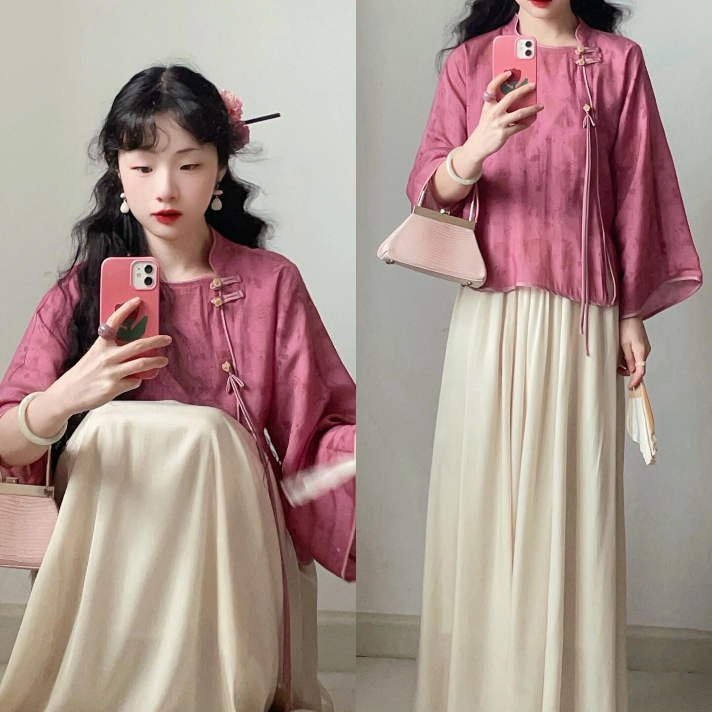 新中式 搭配半身裙套装 国风小衫 衬衫 雾感印花斜襟七分袖 乌莓子酱