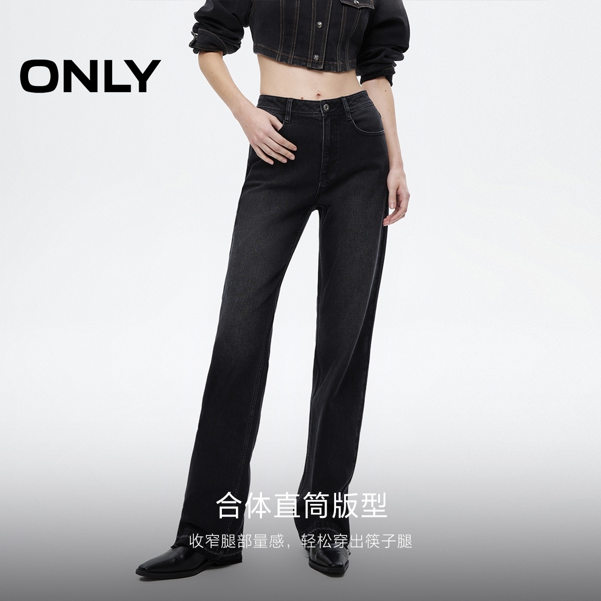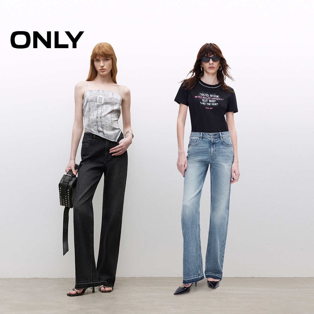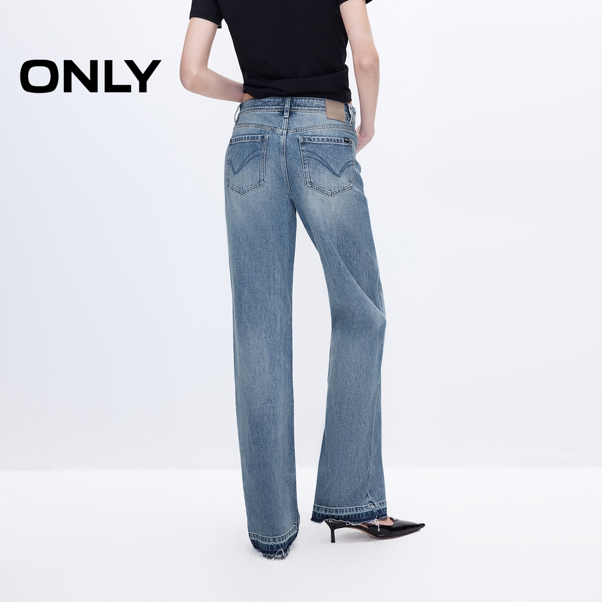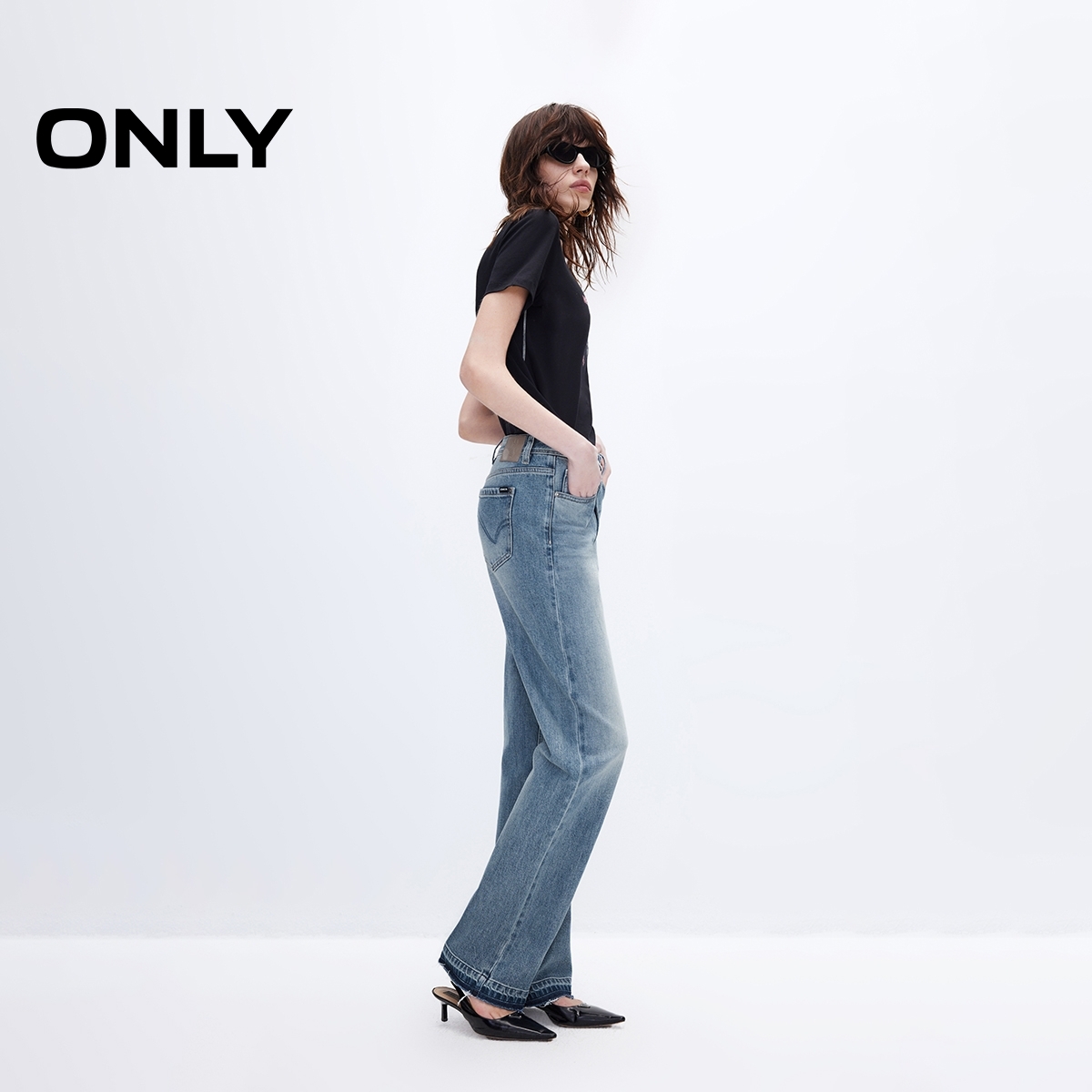 女 做旧复古皮牌斜插高腰松弛显瘦宽松直筒牛仔裤 ONLY2025秋季 新款