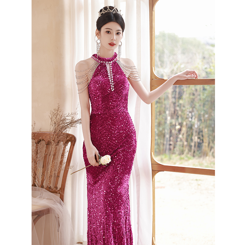 紫缘萱亮片礼服长款 气场女王改良鱼尾旗袍弹力主持走秀女 宴会晚装