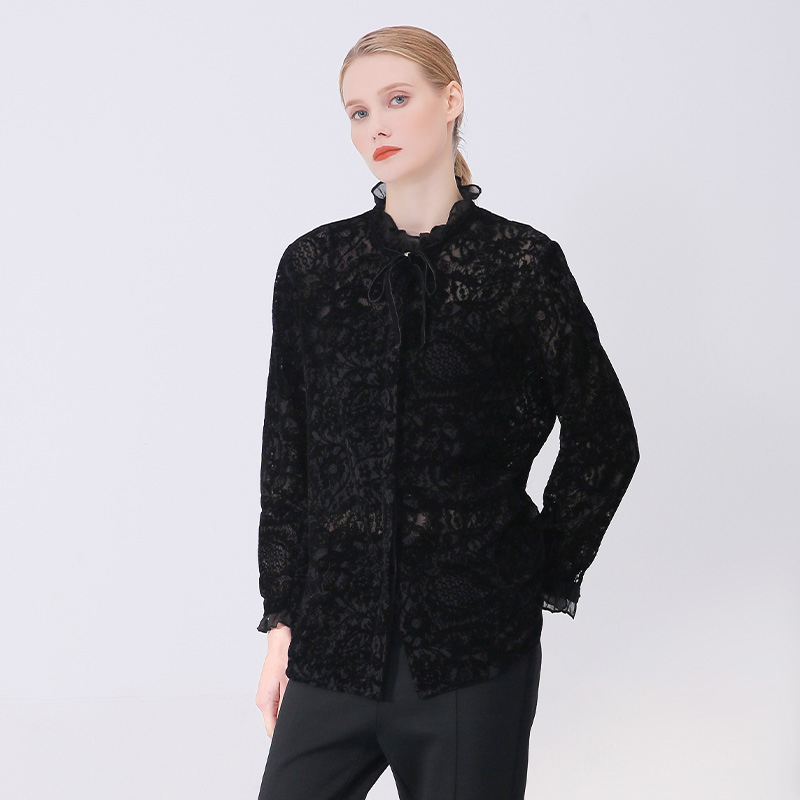 通勤 上衣百搭时尚 马天奴早秋新款 黑色立领丝绒烧花系带花边领衬衫