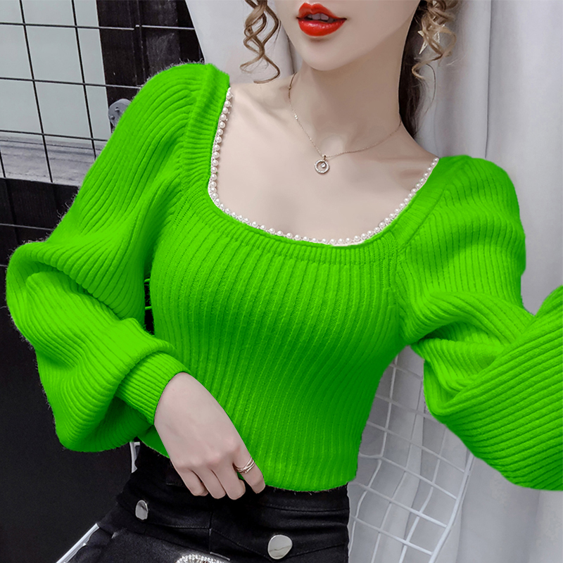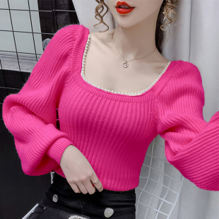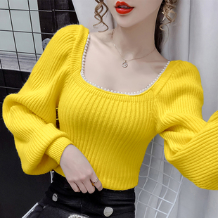上衣套头打底衫 方领灯笼袖 针织衫 洋气修身 毛衣女外穿2025春秋新款