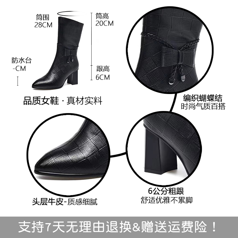 靴子 加绒粗跟中筒靴气质短靴真皮鞋 2024年新款 尖头高跟女靴秋冬季