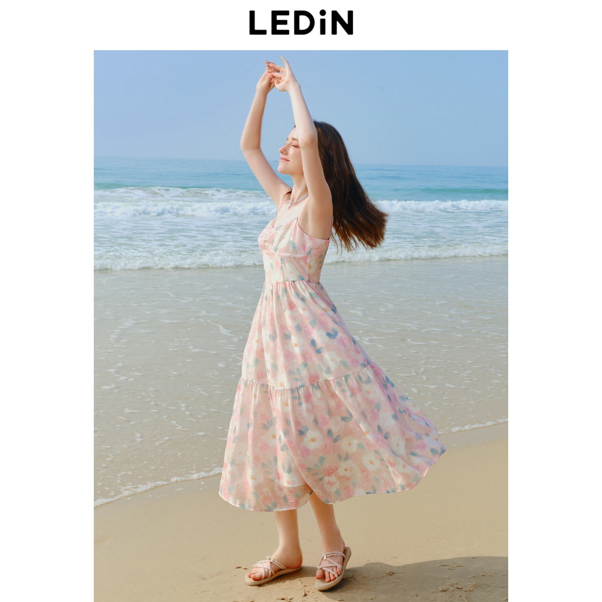 乐町油画碎花连衣裙年夏季 浪漫吊带连衣裙气质显瘦收腰长裙 新款