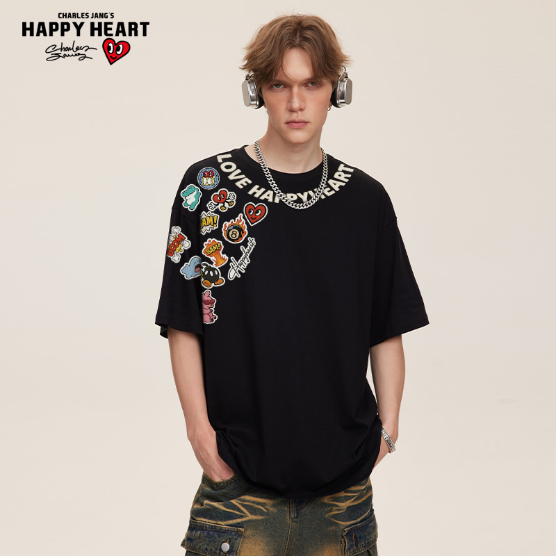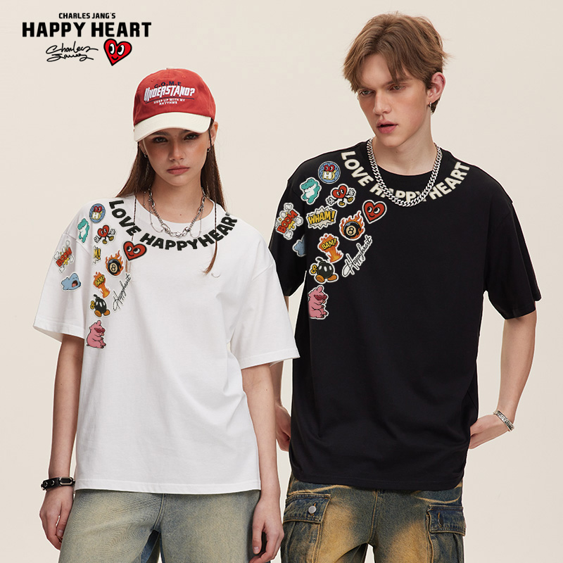 纯棉百搭宽松半袖 查尔斯桃心 t恤男夏季 趣味卡通涂鸦印花短袖 美式