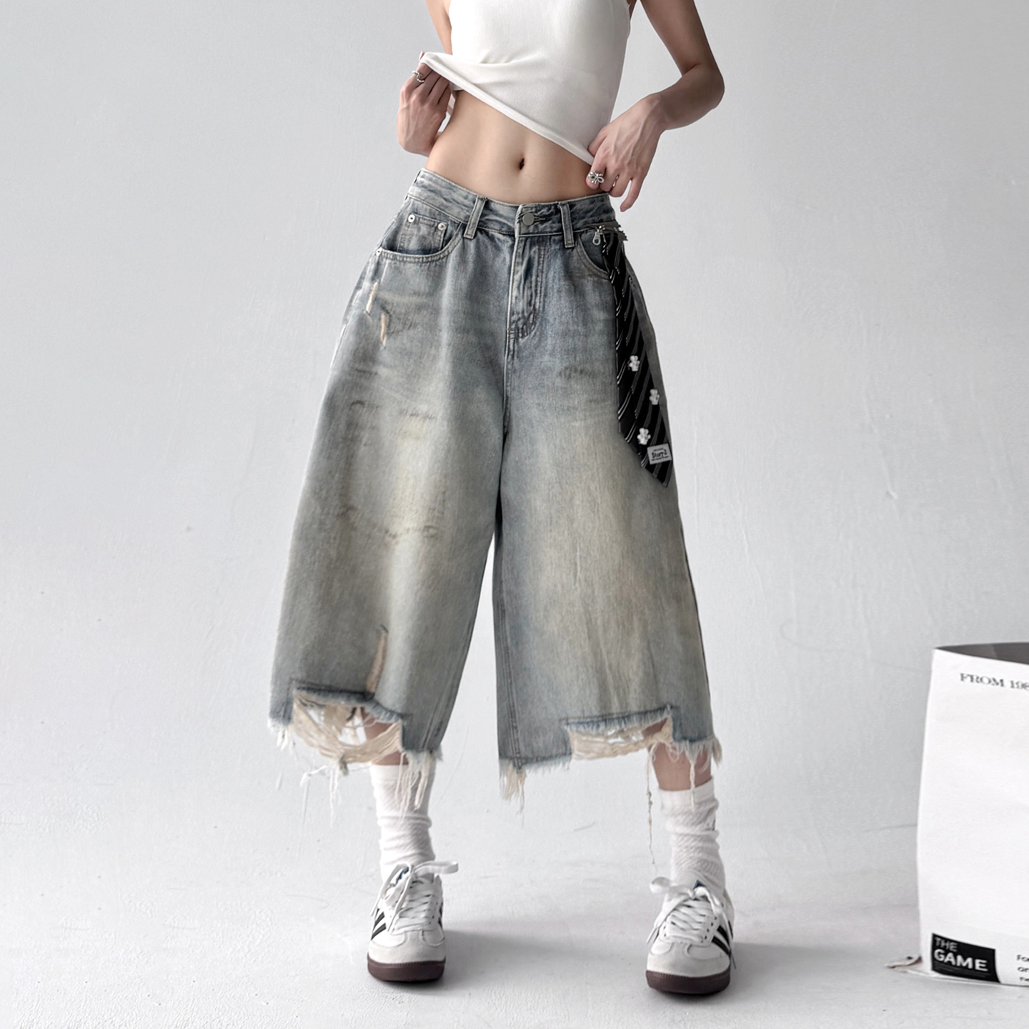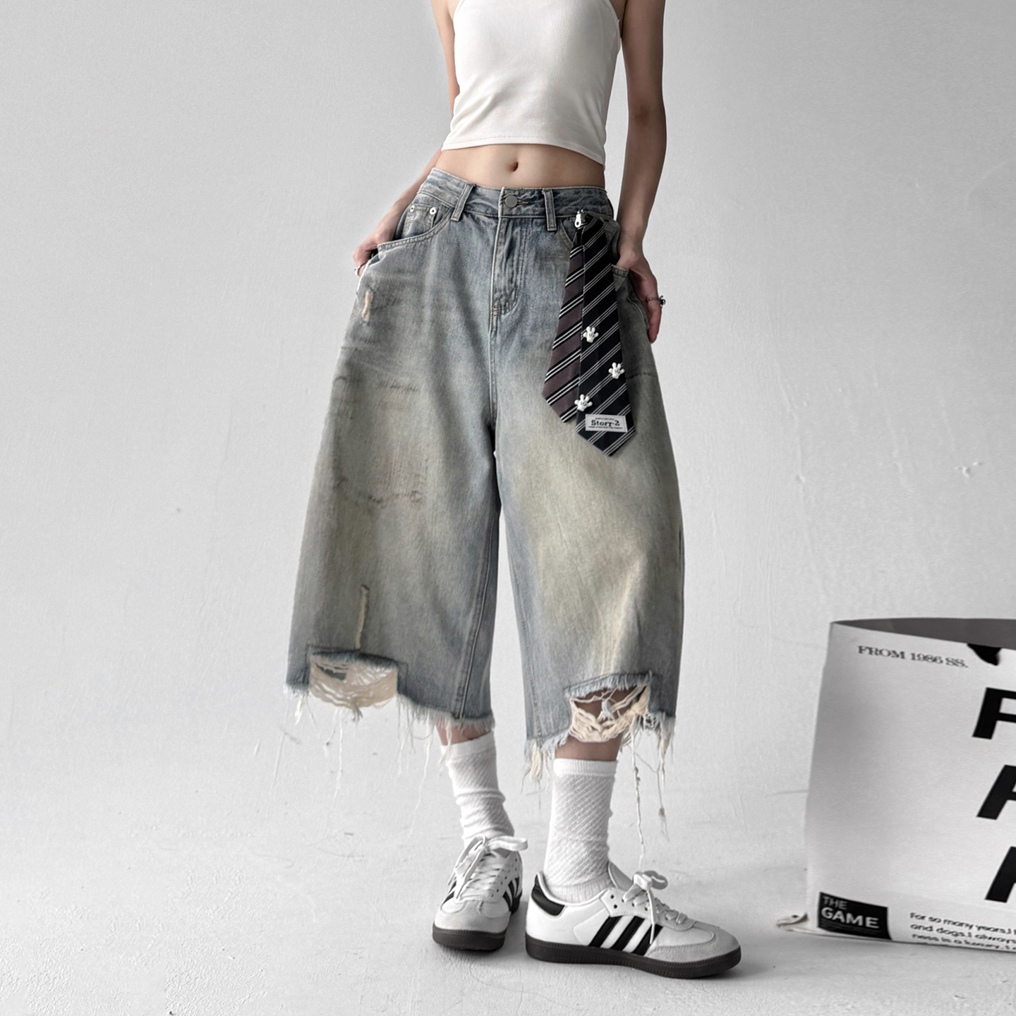 街头破洞做旧五分裤 美式 新款 女2025夏季 复古领带拼接牛仔七分裤