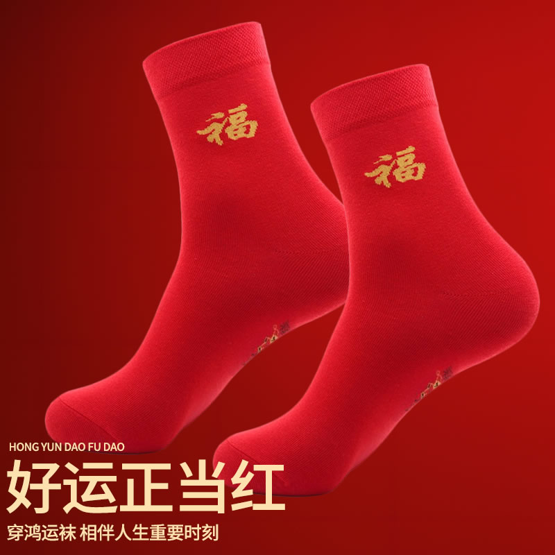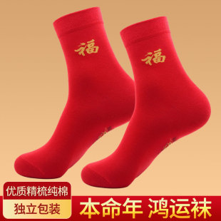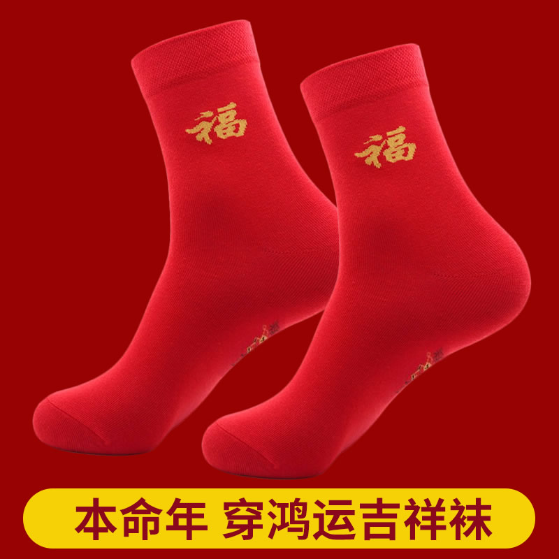 中老年人本命年袜子蛇年红色中筒女款 秋冬男大红色纯棉生肖年结婚