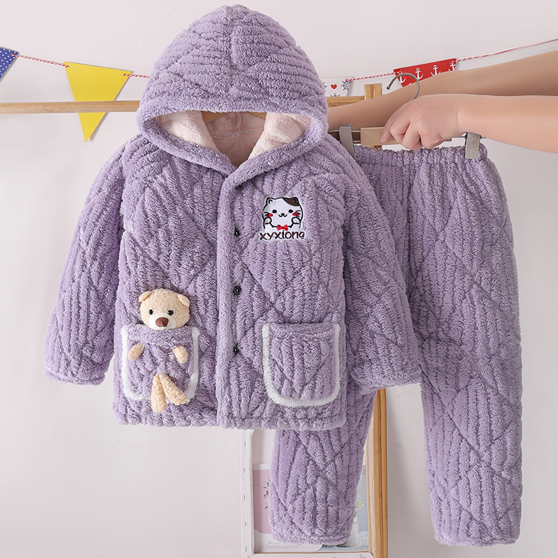 加厚珊瑚绒三层夹棉中大童男孩家居服2024新款 儿童睡衣男童冬季 款