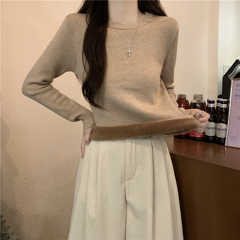 打底针织衫 长袖 上衣 内搭圆领修身 加厚一体绒保暖灰色毛衣女秋冬季