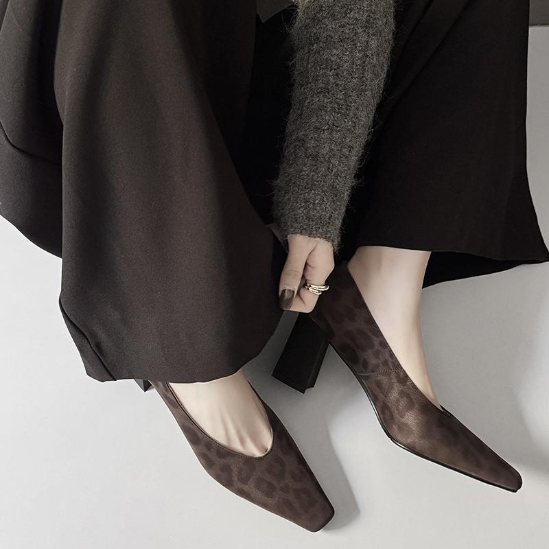 女2025新款 平底浅口女鞋 秋季 复古方头单鞋 法式 达芙妮豹纹玛丽珍鞋