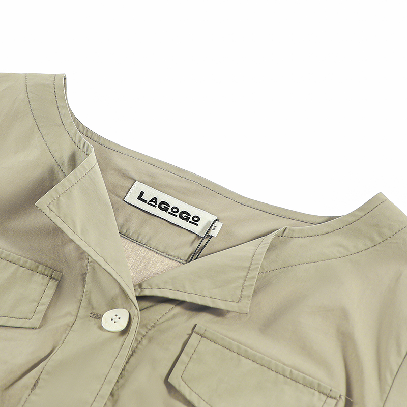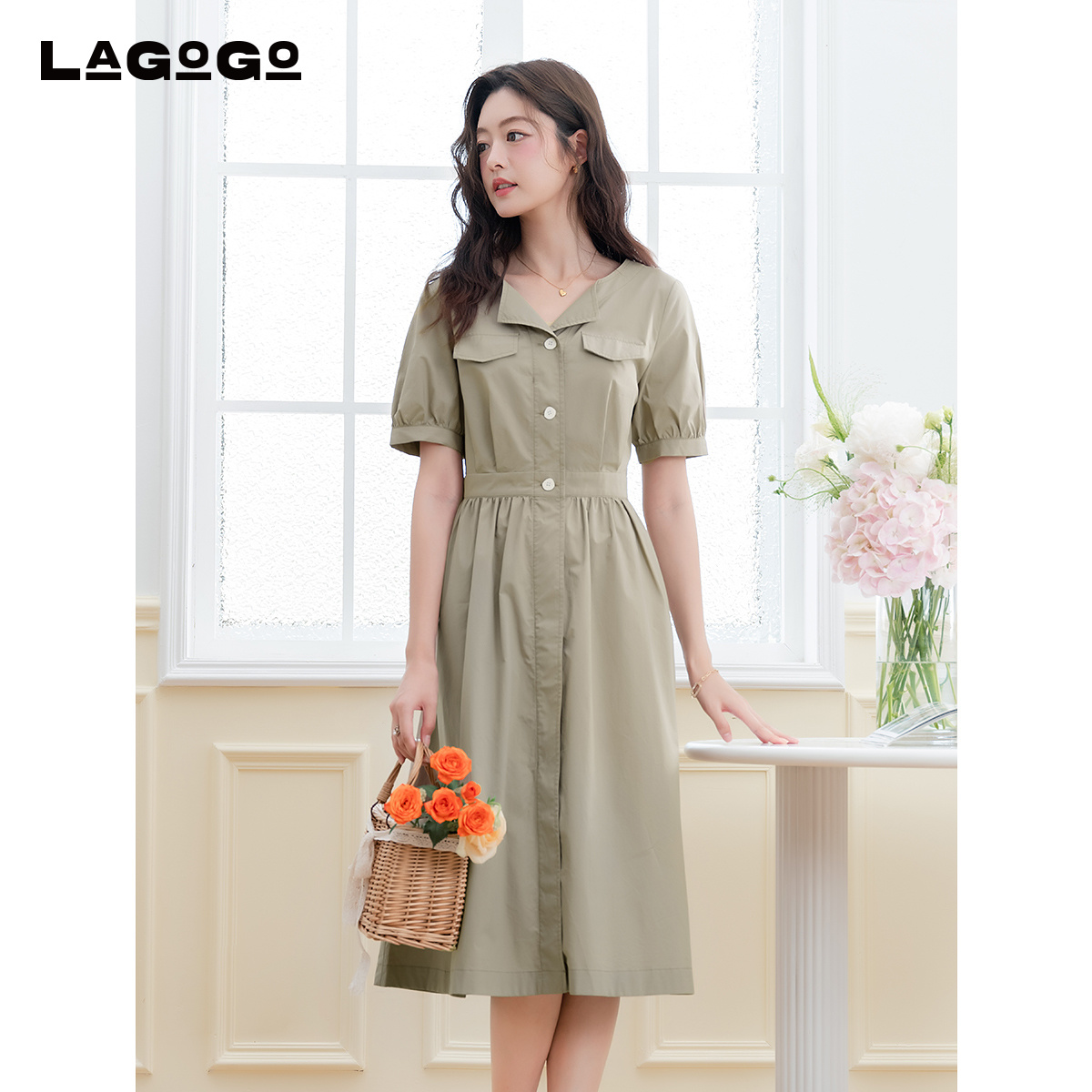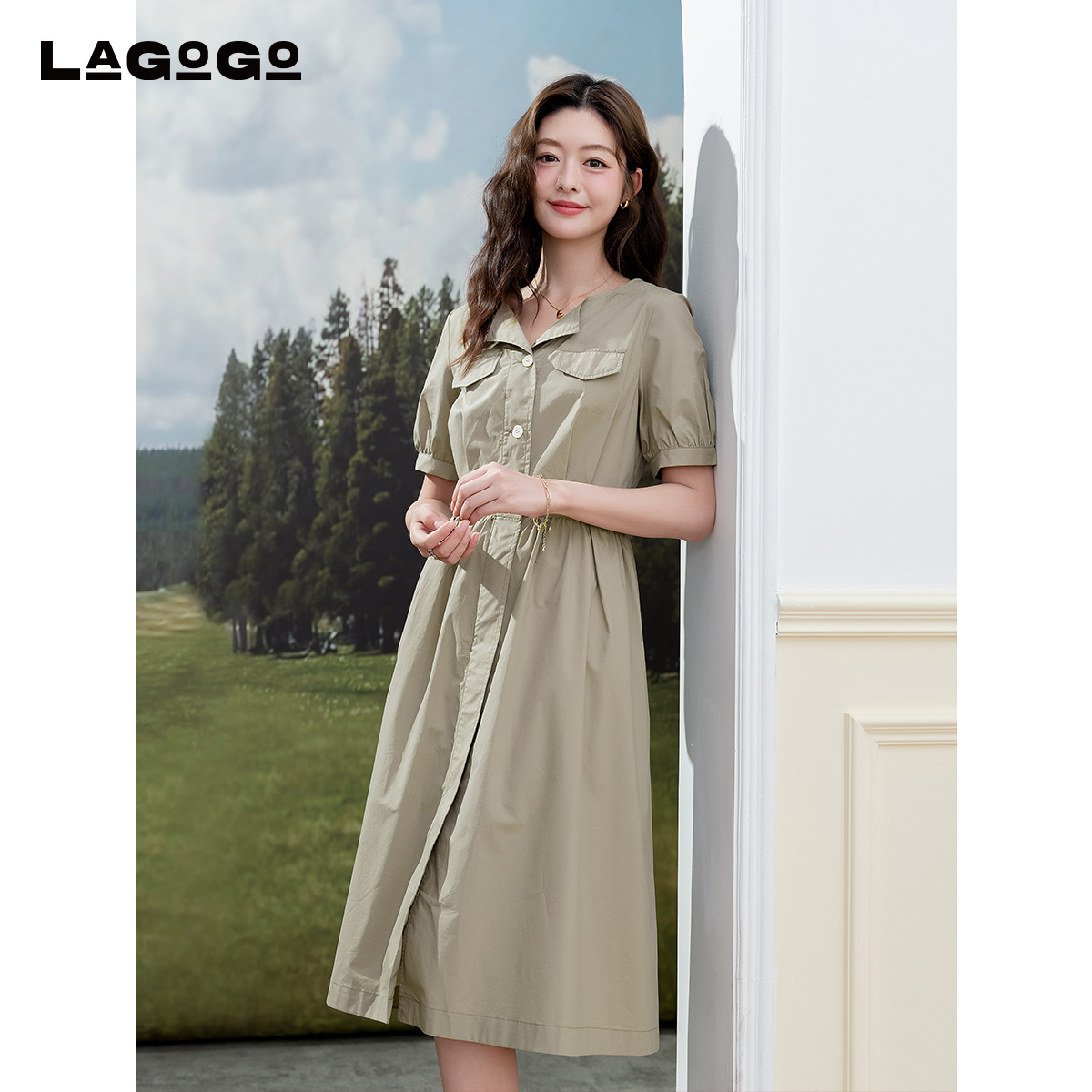 LAGOGO纯色全棉高腰A字裙女拉谷谷2025年夏季 显瘦通勤连衣裙 新款