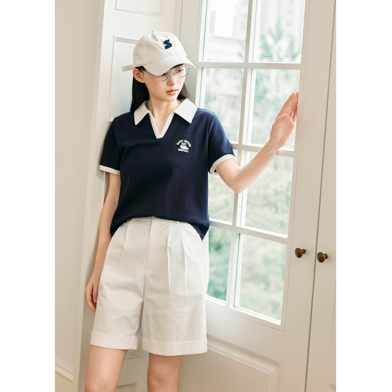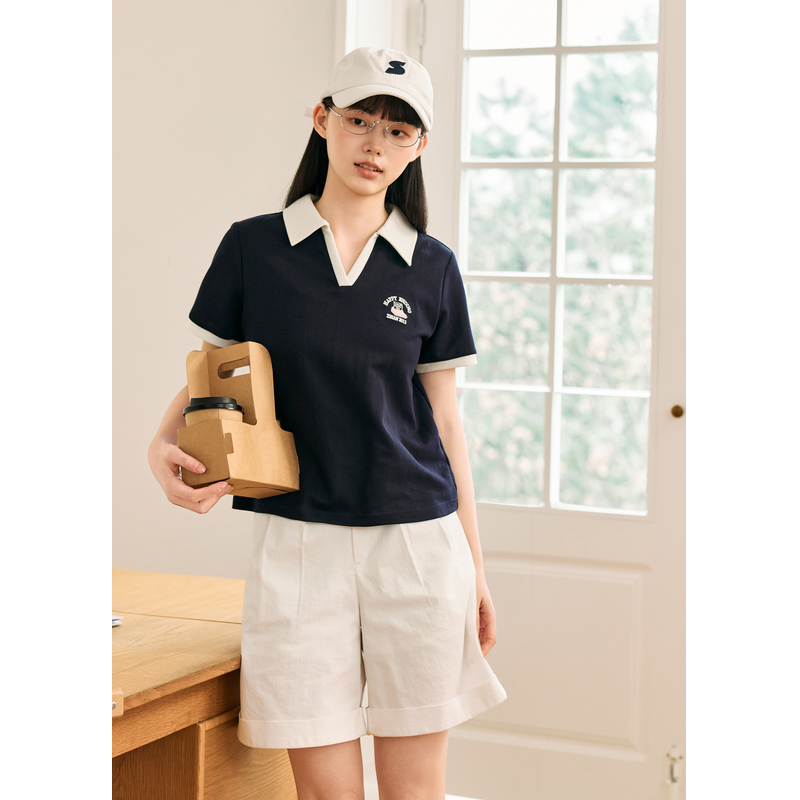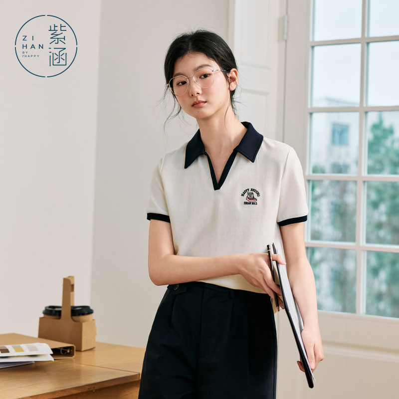 学院风简约通勤休闲上衣 新款 紫涵polo领撞色短袖 T恤女2025年夏季