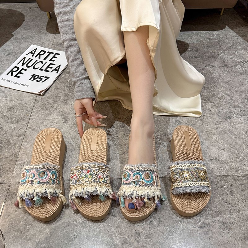 沙滩拍照出片凉拖鞋 度假夏日流苏厚底一字拖女夏季 波西米亚风拖鞋