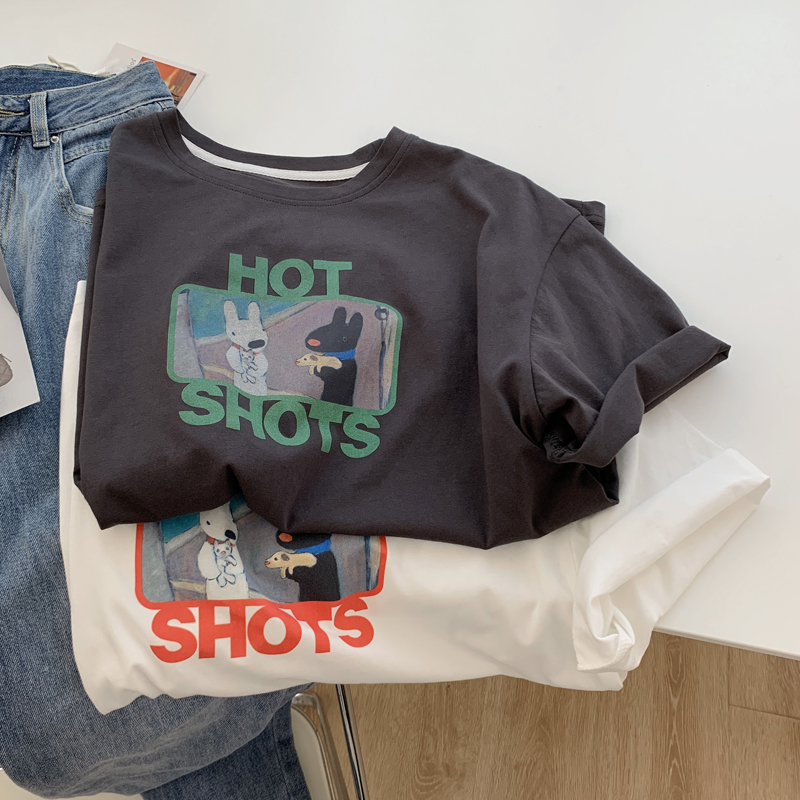 气质深灰色撞色字母印花卡通圆领短袖 T恤女宽松慵懒风减龄上衣夏