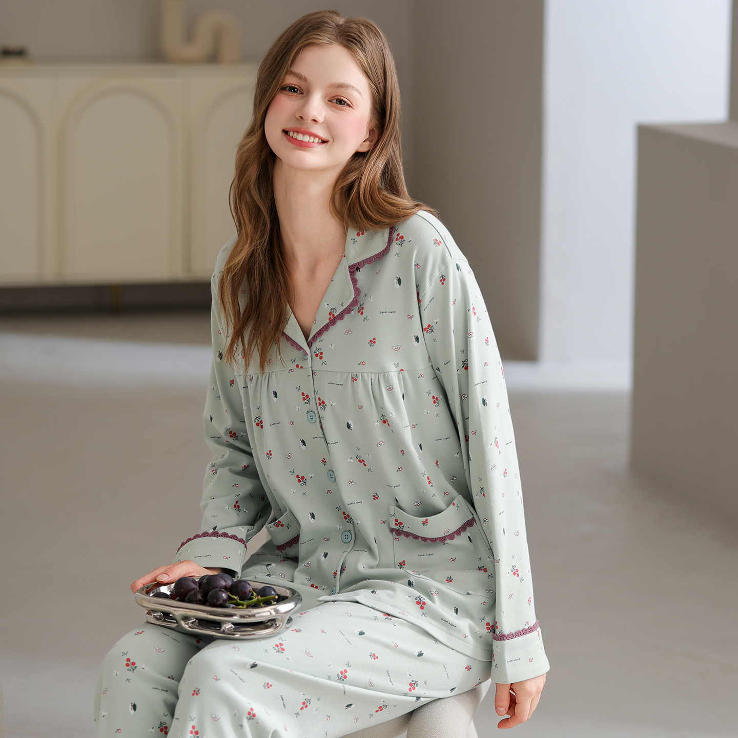 睡衣女春秋季 休闲加大码 纯棉长袖 开衫 宽松全棉家居服 套装 芬腾新款