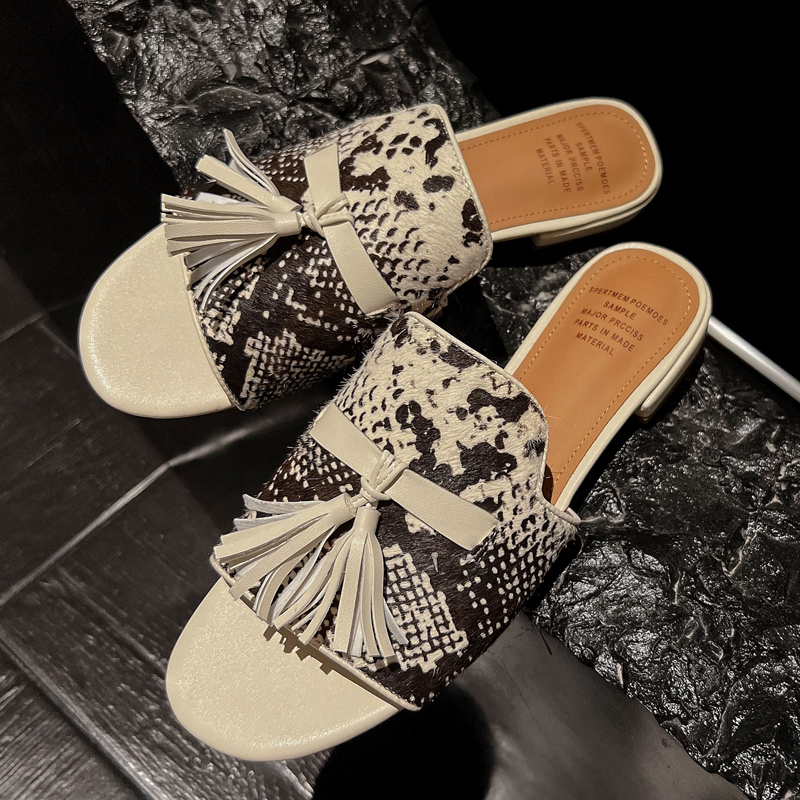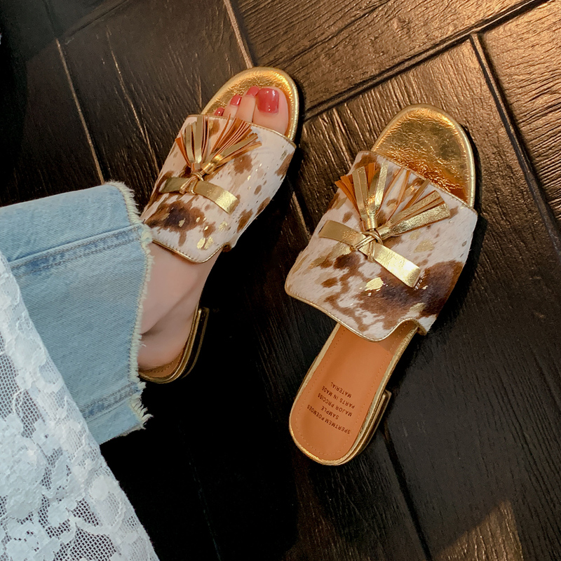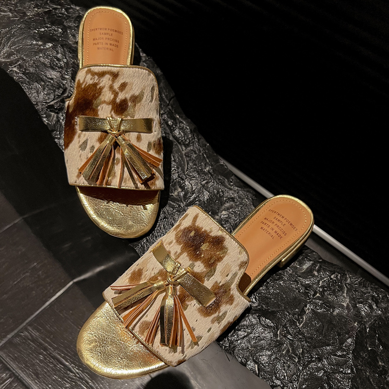 2024新款 女款 小众设计流苏马毛平底一字拖金色凉拖鞋 流浪艺术家