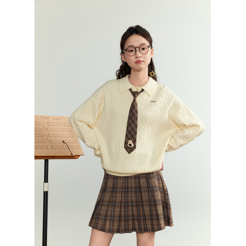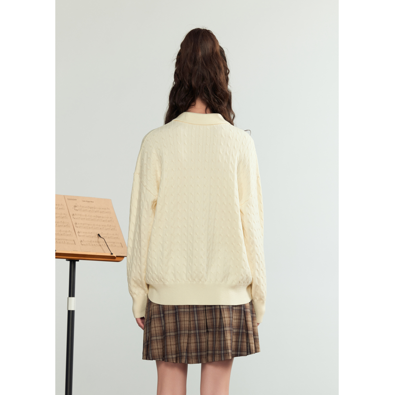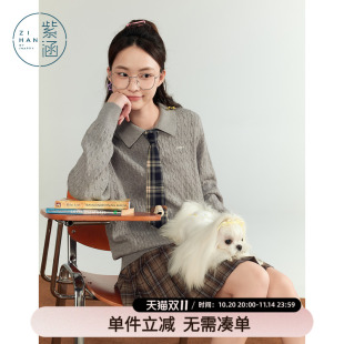 学院风休闲麻花肌理宽松长袖 新款 毛衣 女秋季 紫涵POLO领套头针织衫