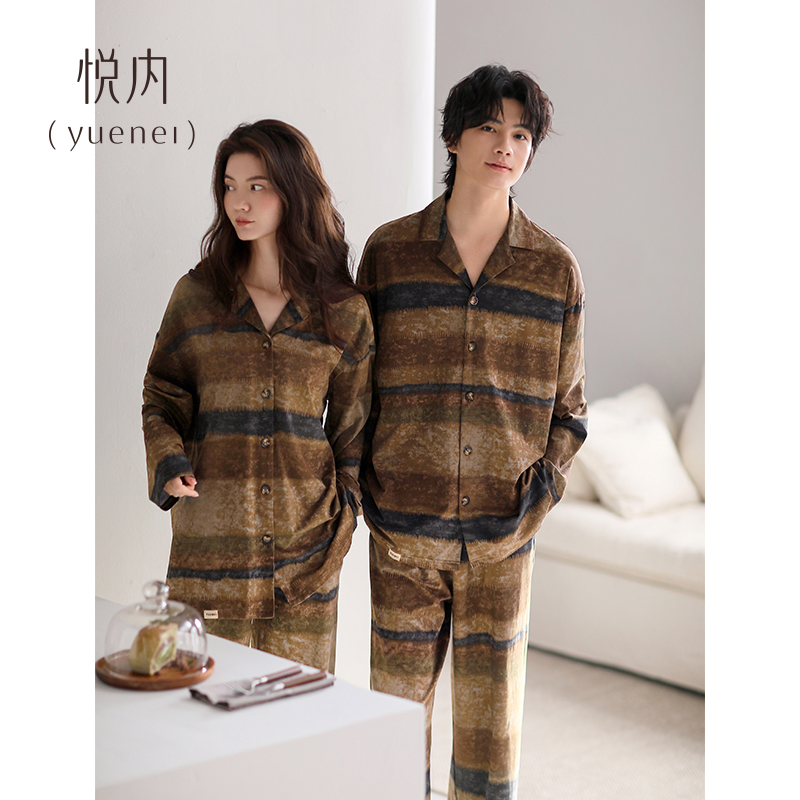 复古老钱风套装 悦内情侣睡衣女春秋款 纯棉家居服秋天男士 长袖 秋季