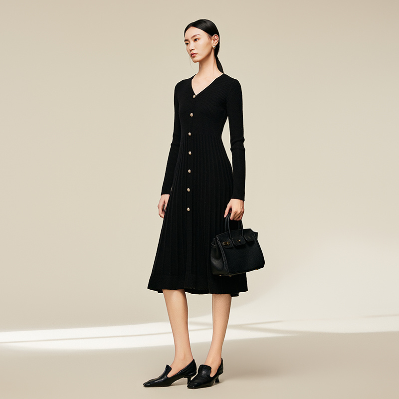 黑色优雅绵羊毛V领连衣裙MOFAN摩凡2025秋冬新款 荷叶边A字百褶裙