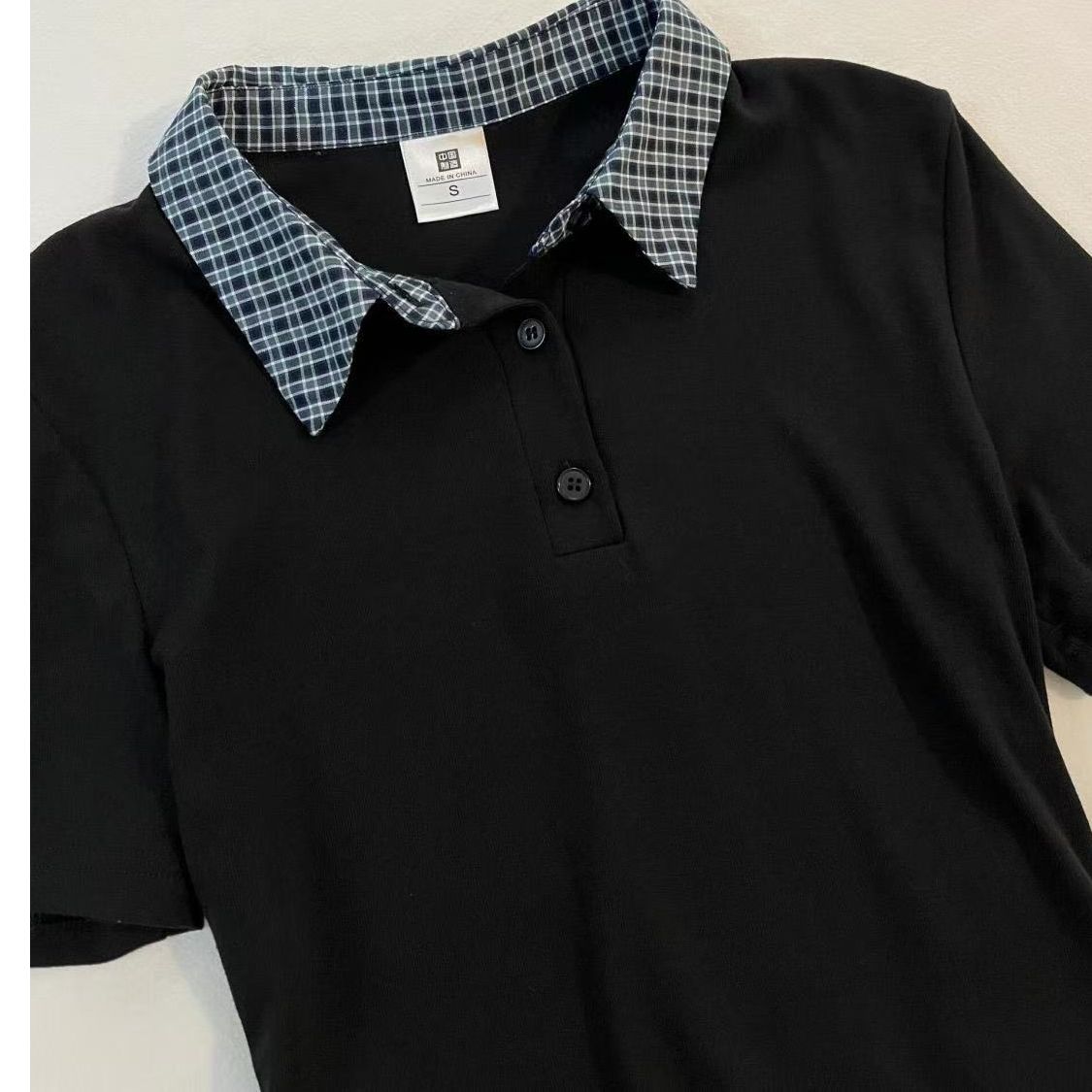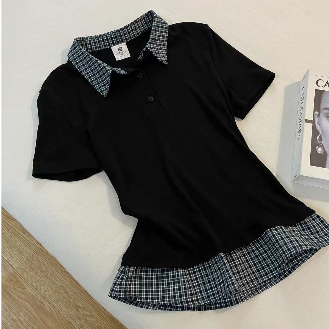 假两件格子拼接设计感减龄显瘦上衣 新款 Polo领短袖 T恤女2025夏季