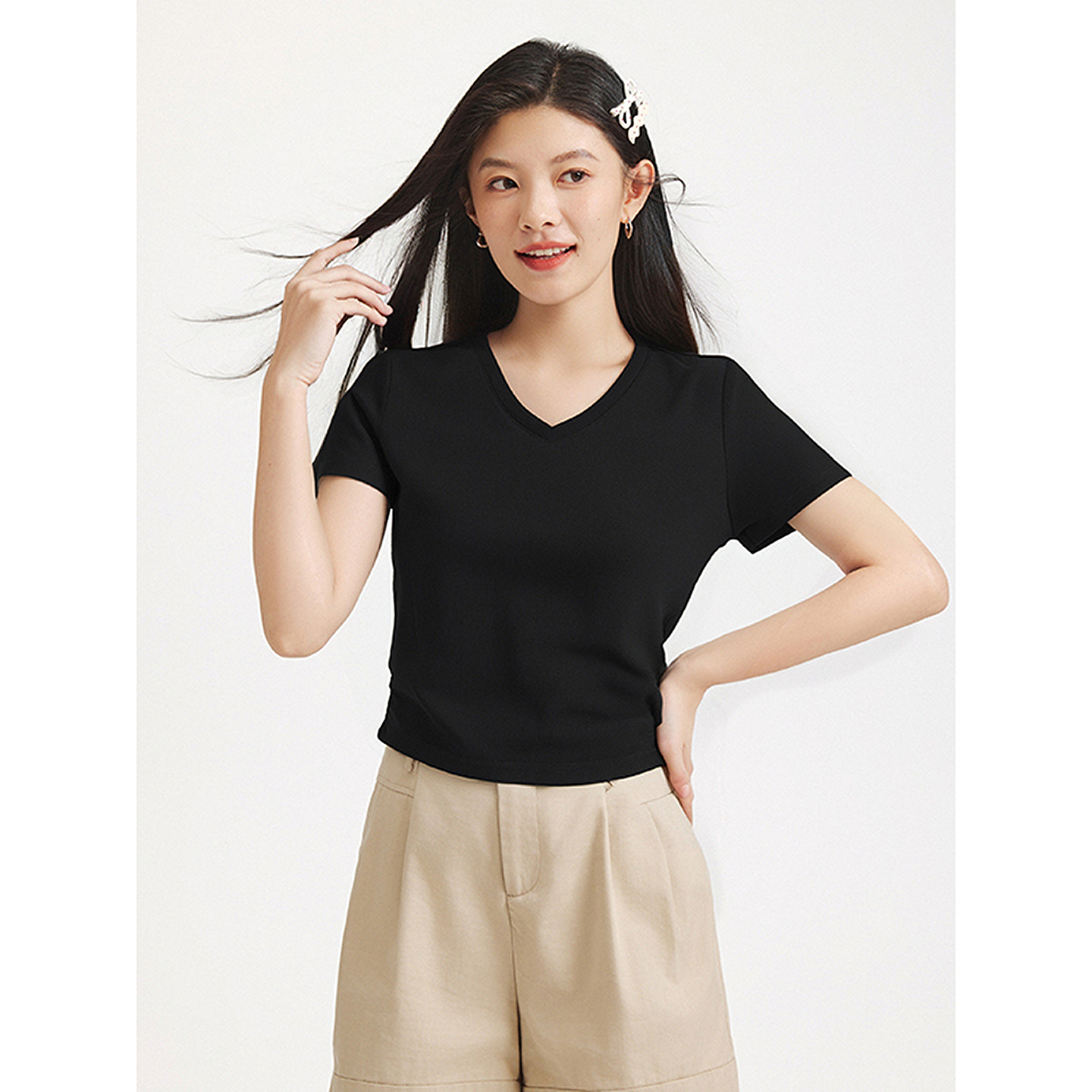 黑色显瘦基础内搭上衣 新款 热风女士短袖 T恤V领收腰上衣2025年夏季