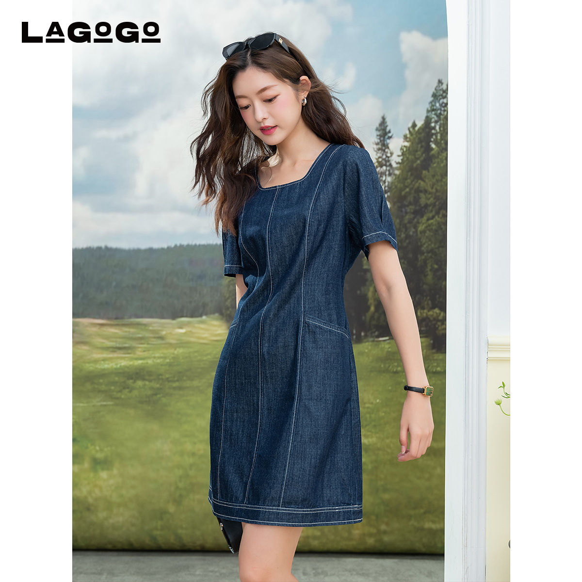 设计师款 裙女细格纹花边立领半开襟连衣裙18465227 佐丹奴宽松衬衫