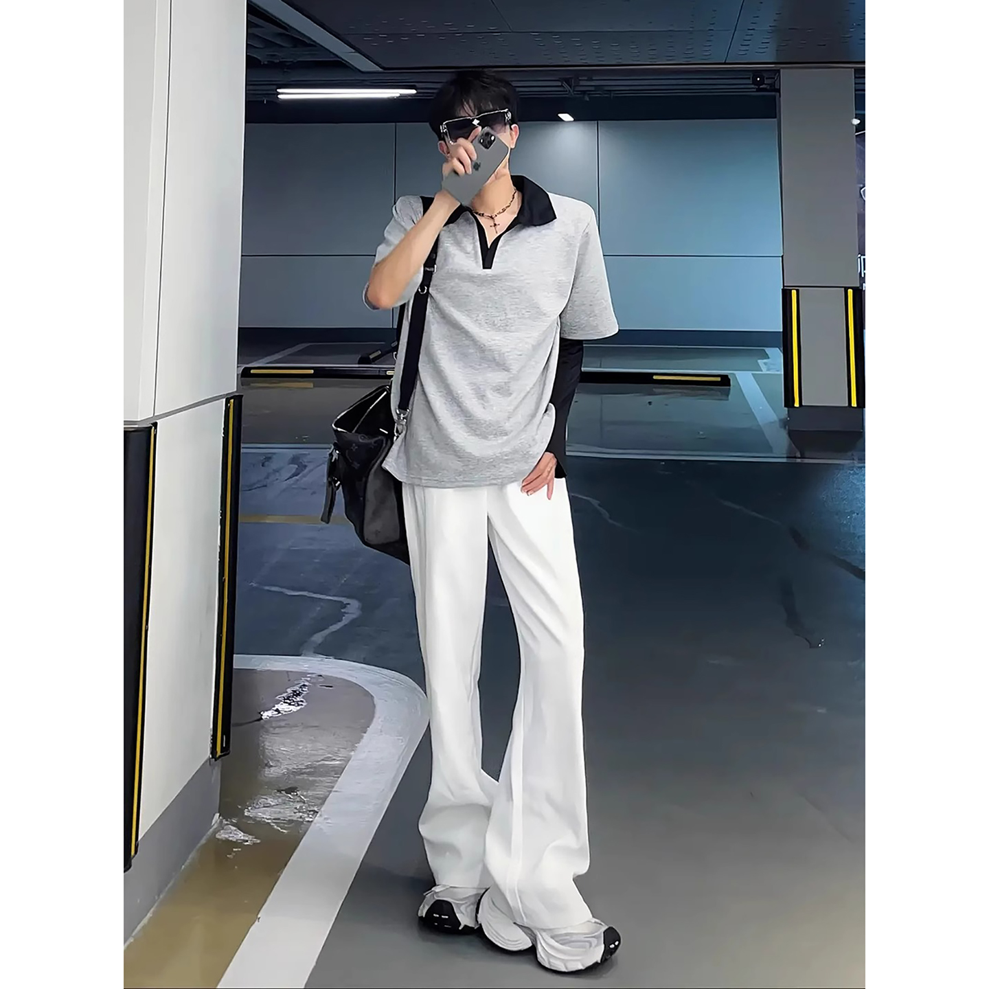 翻领五分半袖 浅灰色v领垫肩短袖 高级感美式 夏季 老钱风休闲t恤 男款