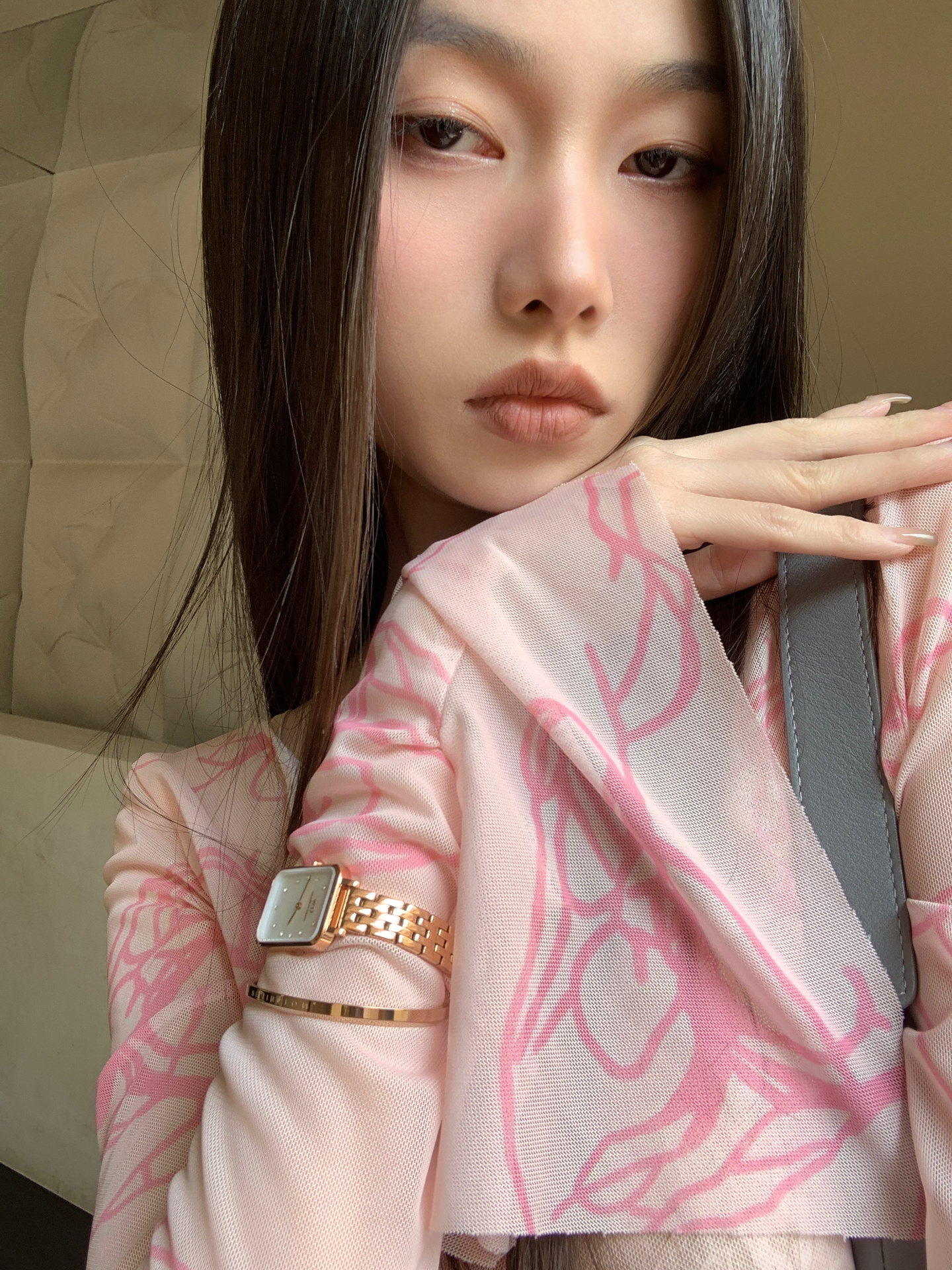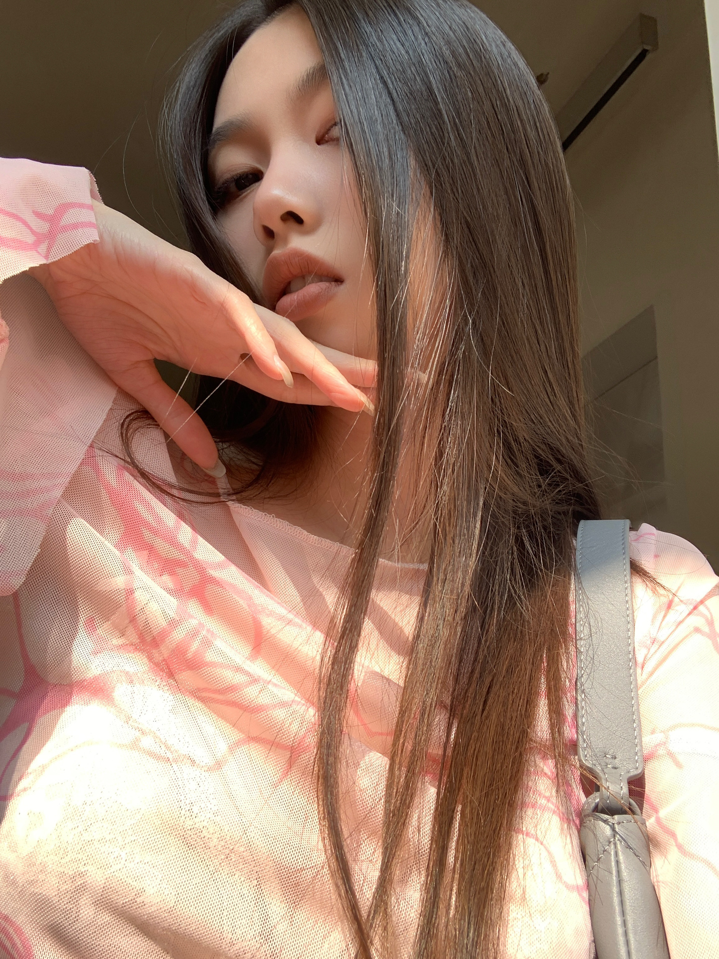 网纱上衣 显瘦喇叭袖 辣妹粉色正肩长袖 t恤女夏设计感小众性感修身