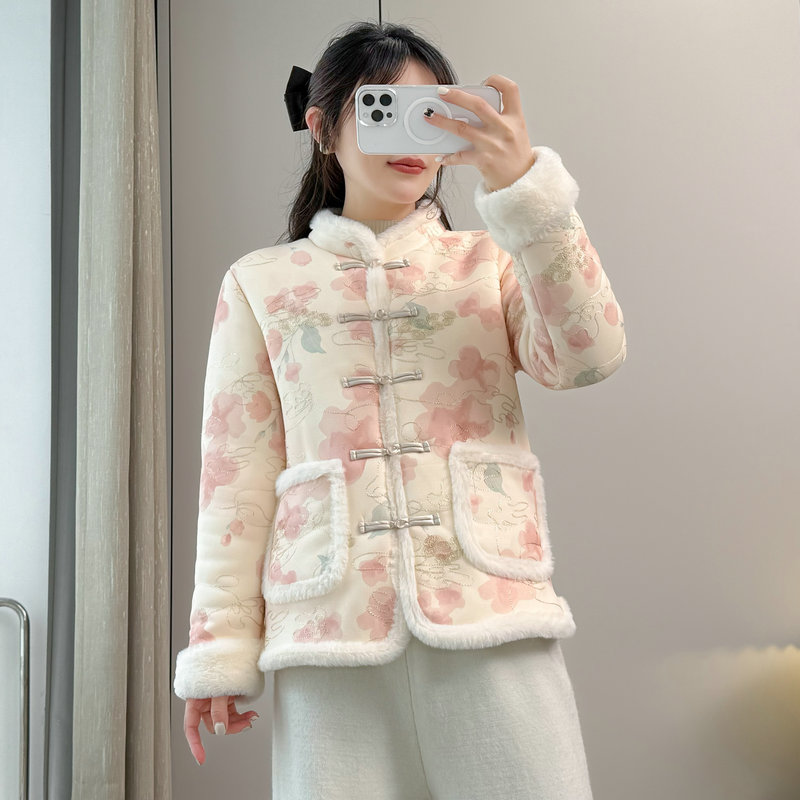 年轻款 花棉袄女民族风复古盘扣棉衣东北大花棉服外套 加绒加厚冬季