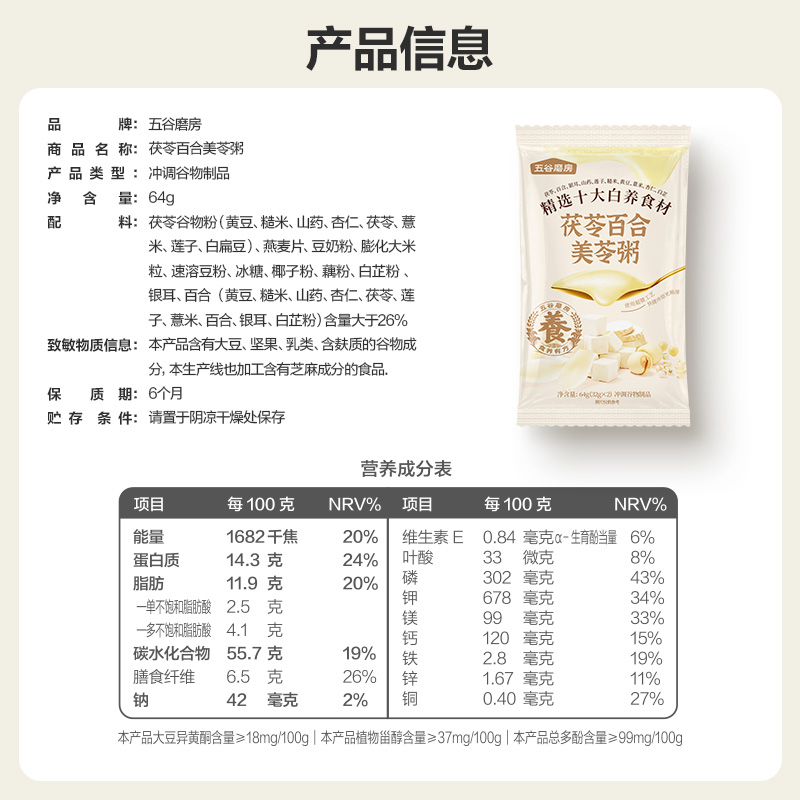 五谷磨房茯苓百合美龄粥64g体验装 营养早餐代餐粉