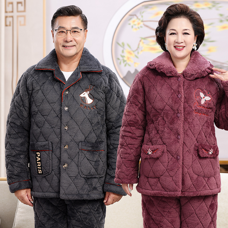 中老年睡衣女情侣珊瑚绒保暖三层夹棉男士 加厚加绒爸爸妈妈秋冬季