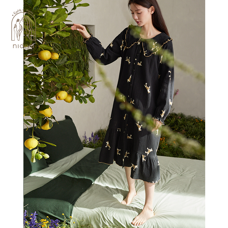 可外穿家居服 宽松中长款 妮狄娅2024睡衣睡裙女春秋季 纯棉纱布长袖