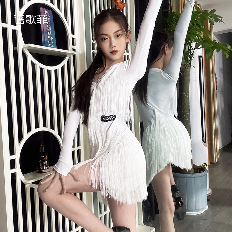 语歌菲拉丁舞服表演服女童秋冬长袖 飘逸流苏演出服连体练功服女