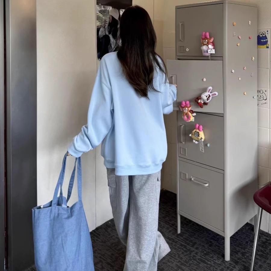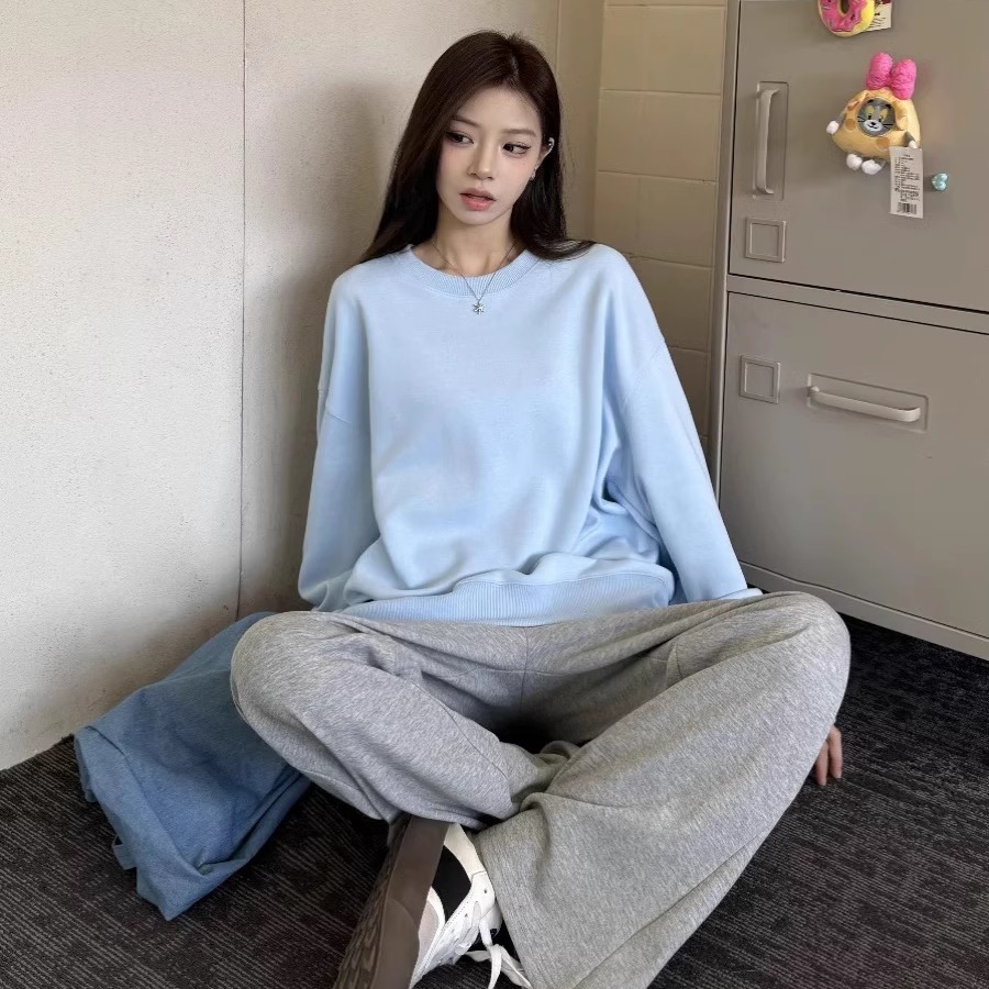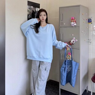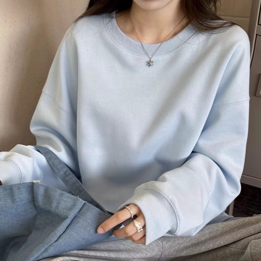 上衣 小众别致绝美长袖 奶蓝色圆领纯色纯棉卫衣女早秋2025新款 薄款