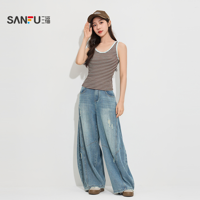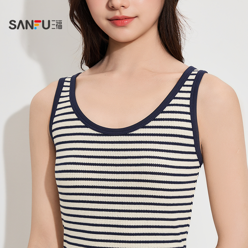 休闲修身 时尚 透气吊带上衣504859 条纹宽肩U领背心 三福女秋季