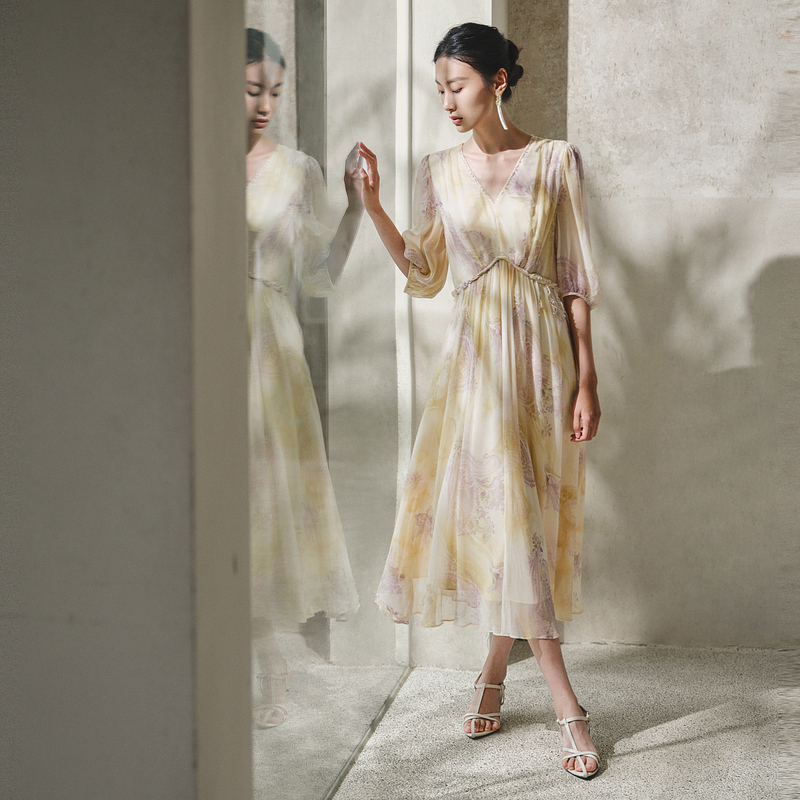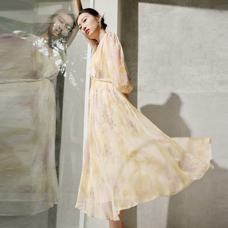新款 水云间女装 V领优雅气质桑蚕丝收腰度假碎花连衣裙2025夏季