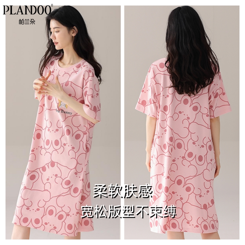 连衣裙休闲卡通睡衣女士家居服2025新款 中长款 纯棉短袖 睡裙女夏季