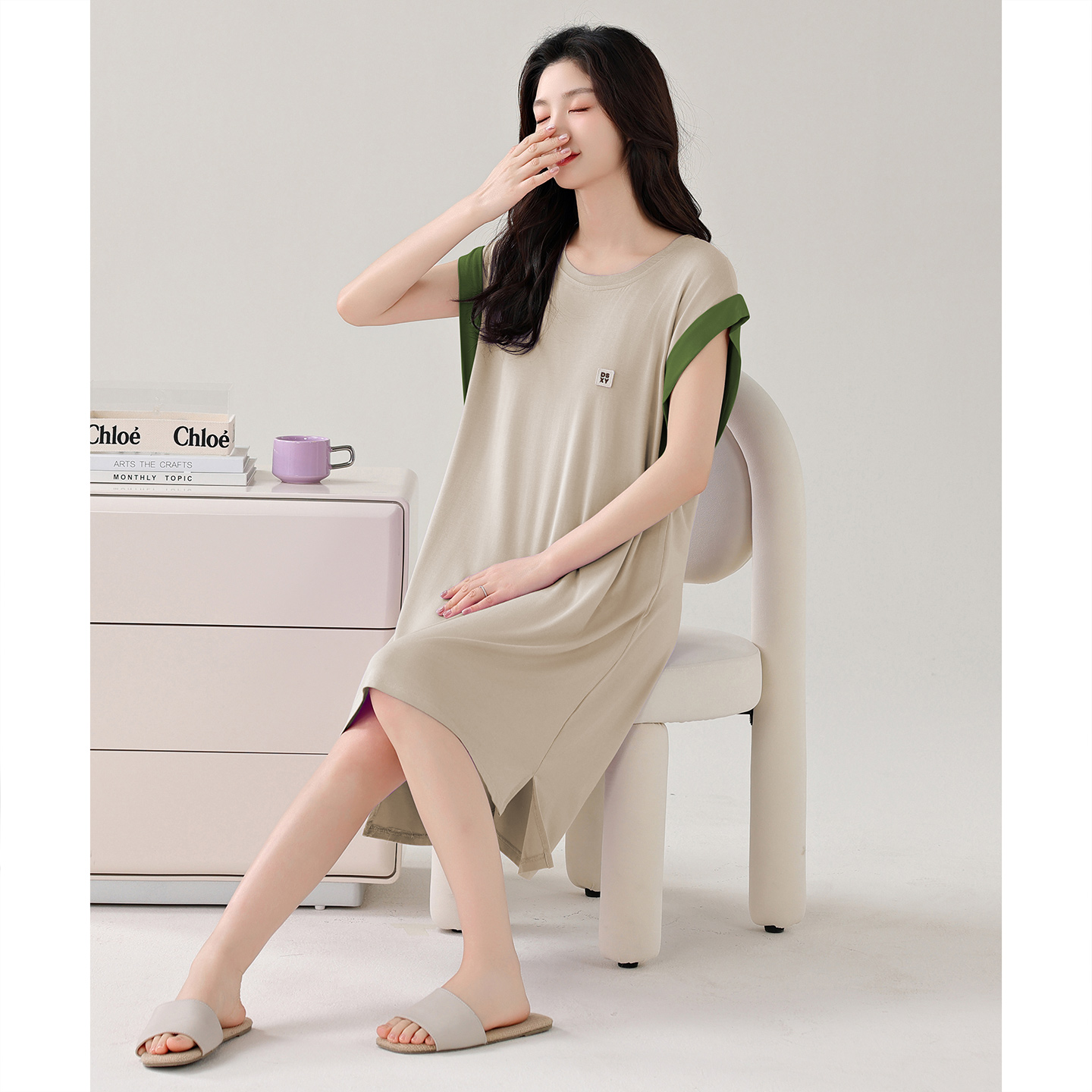 睡衣夏季 韩版 加大码 棉绸睡裙女士短袖 人造棉宽松舒适居家服 加长款