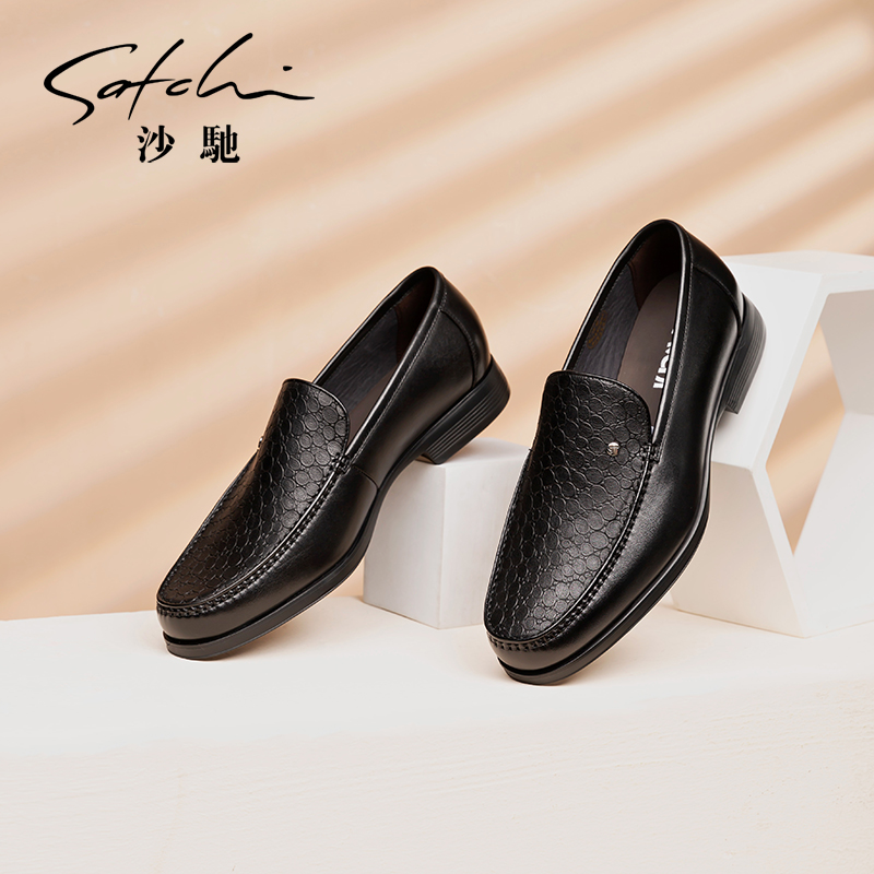 黑色真皮牛皮一脚蹬乐福休闲男士 男款 套脚 2025夏透气皮鞋 沙驰男鞋
