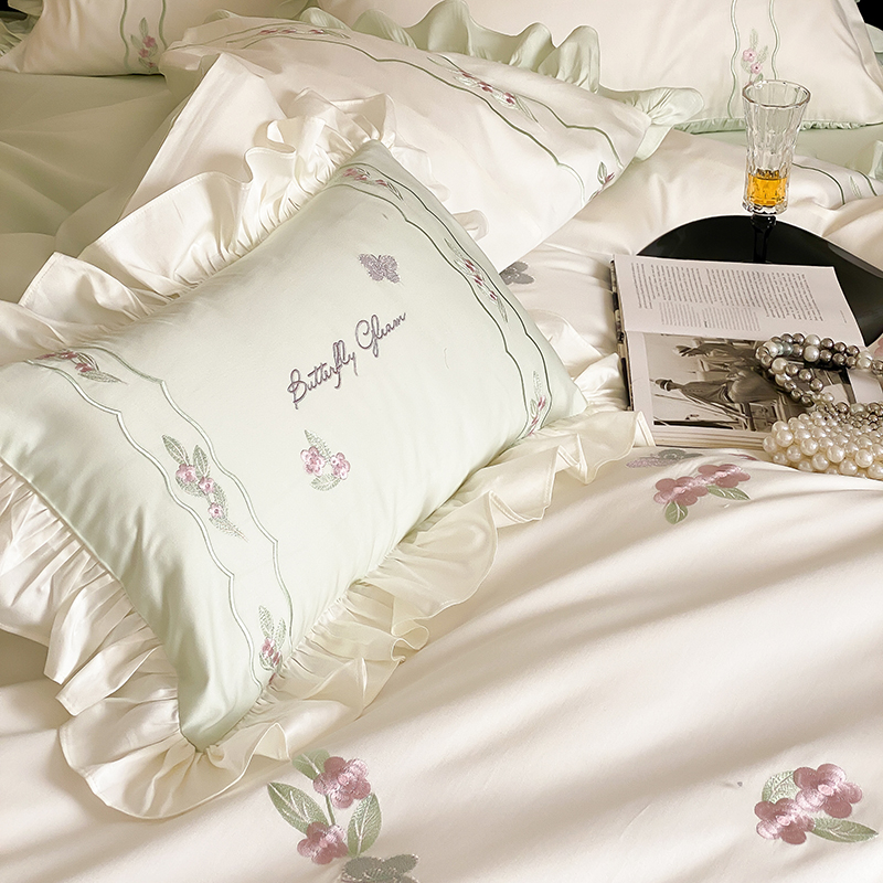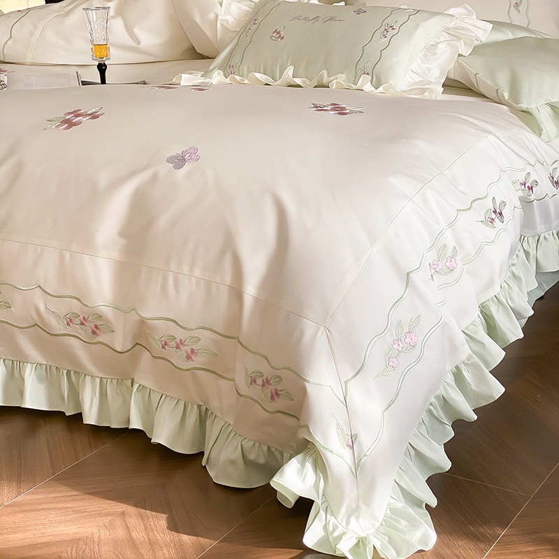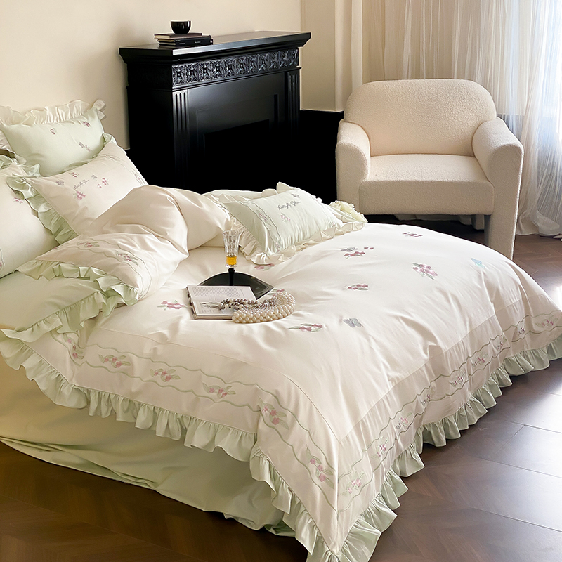 100S全棉刺绣小清新四件套纯棉花边床单被套床上用品