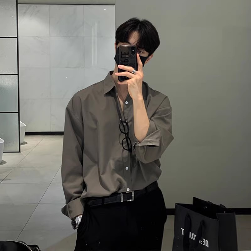 韩版 春秋季 男长袖 帅气咖灰色衬衫 潮流宽松商务休闲衬衣高级感 新款