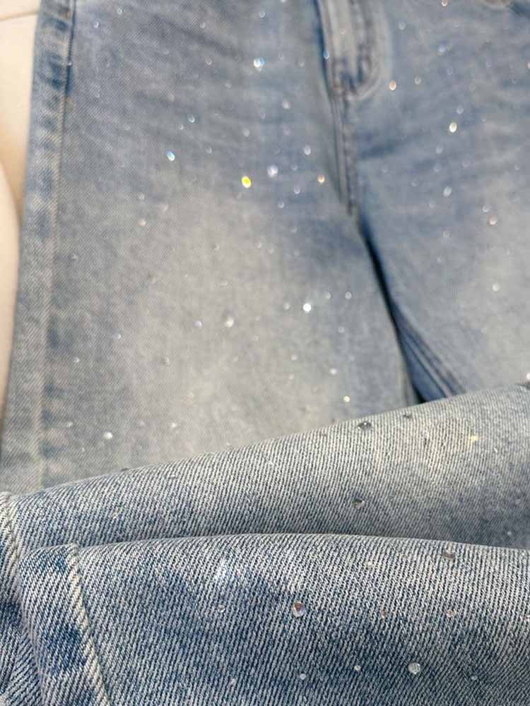 韩版 宽松显瘦休闲直筒裤 百搭女生 女夏季 高腰烫钻高腰浅色牛仔裤