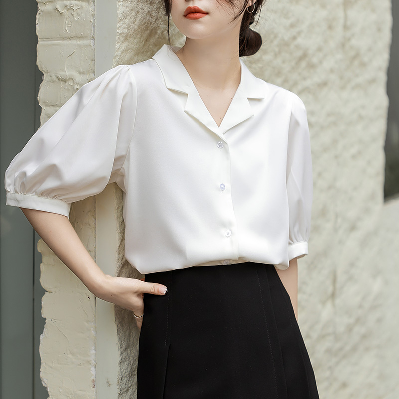 衬衫 减龄工装 女夏季 洋气时尚 上衣 2022年新款 复古港风白色雪纺短袖