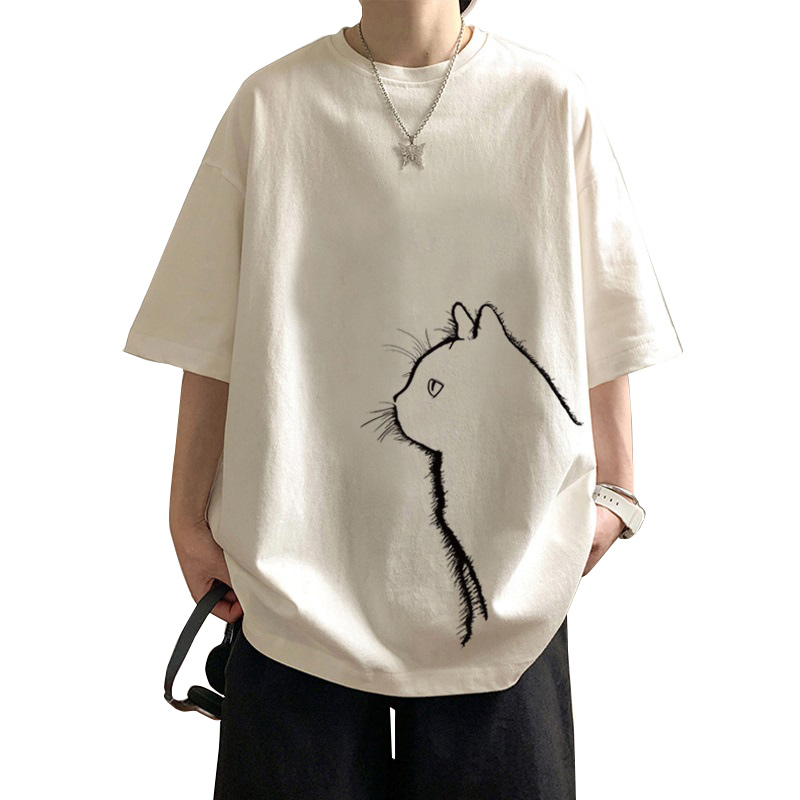 ins潮牌宽松半袖 2025新款 上衣服 T恤男夏季 猫咪印花慵懒风纯棉短袖