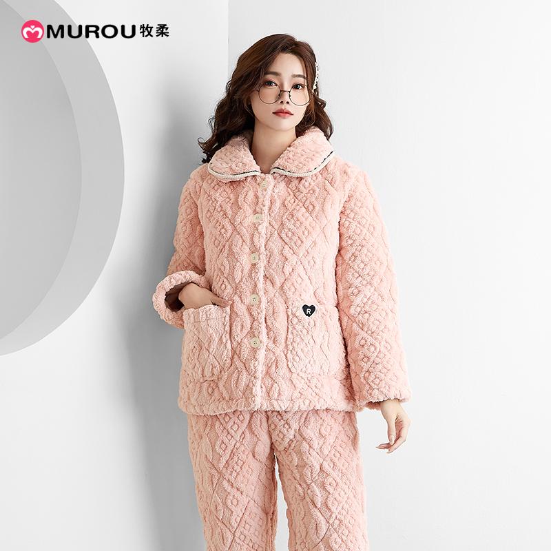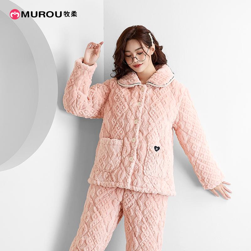 可外穿 珊瑚绒夹棉睡衣套装 牧柔秋冬季 家居服女士三层保暖加厚长袖