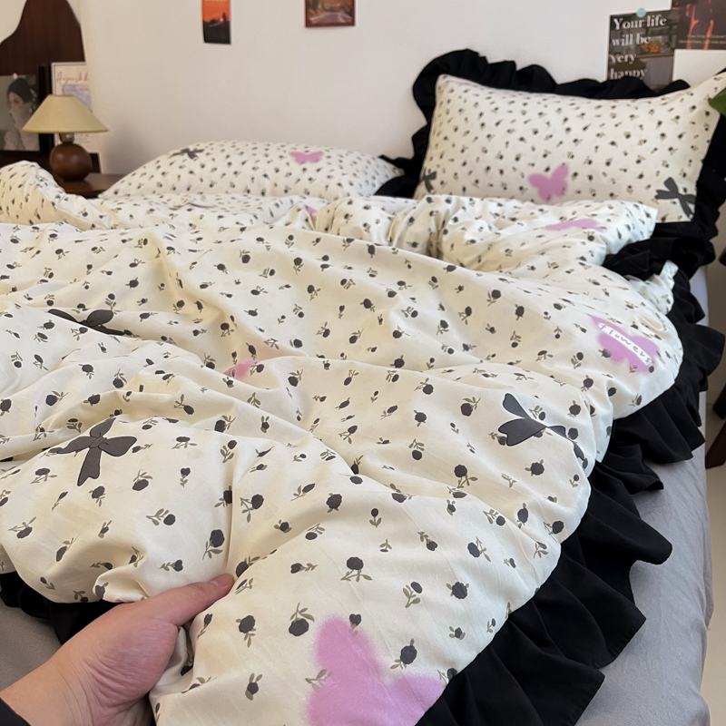 法式 赫本风水洗棉床上用品四件套少女花边床单被套宿舍床笠三件套