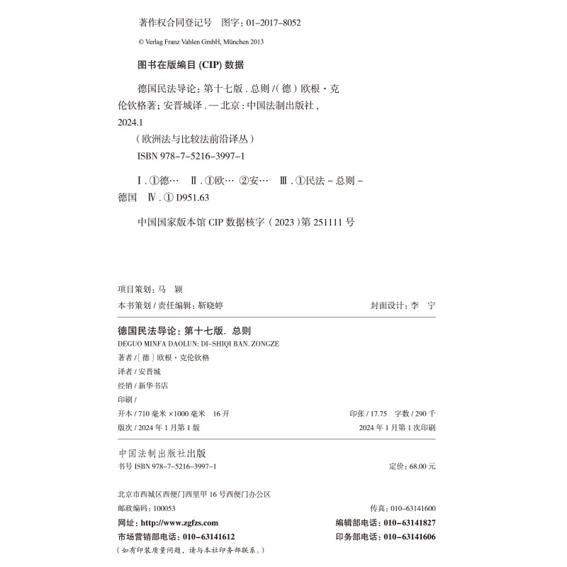 欧根·克伦钦格著 德国畅销民法教科书 德国民法导论 基础读物 欧洲法与比较法前沿译丛 安晋城译 德 第十七版 总则 2024新书 正版
